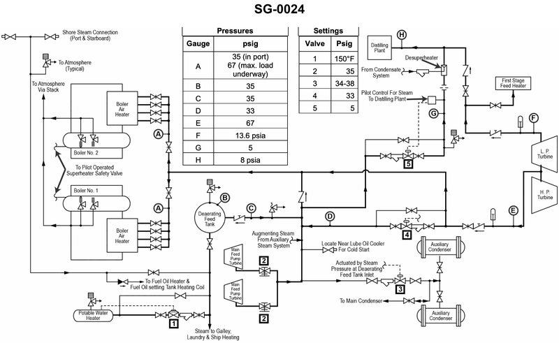According to the illustrated diagram, what is the normal source of heat for the first stage feed heater and the distilling plants when the vessel is underway under full power? Illustration SG-0024