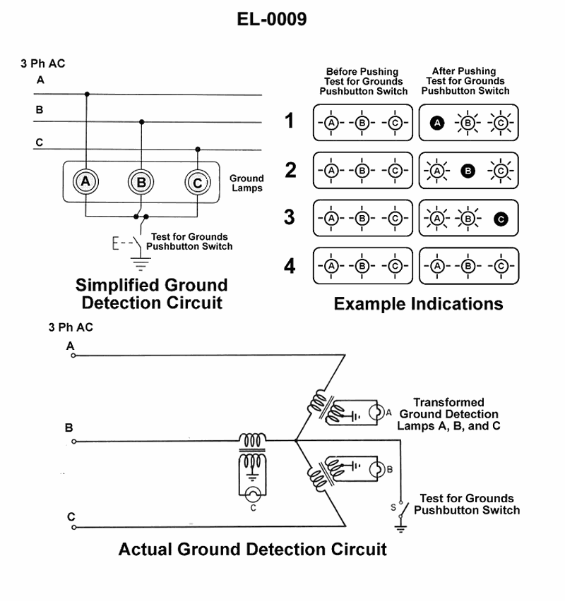 After pushing the test pushbutton of the illustrated high voltage ground detection system, the ground lamps indicate as shown in example #3 where lamps A and B are brighter than normal and lamp C is darker than normal. What does this indicate? See illustration EL-0009.