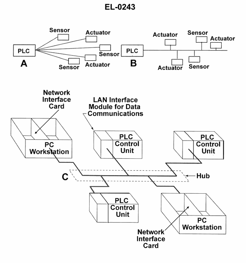 • Look at how the PLC, sensors, and actuators are arranged along the main communication path in illustration B.