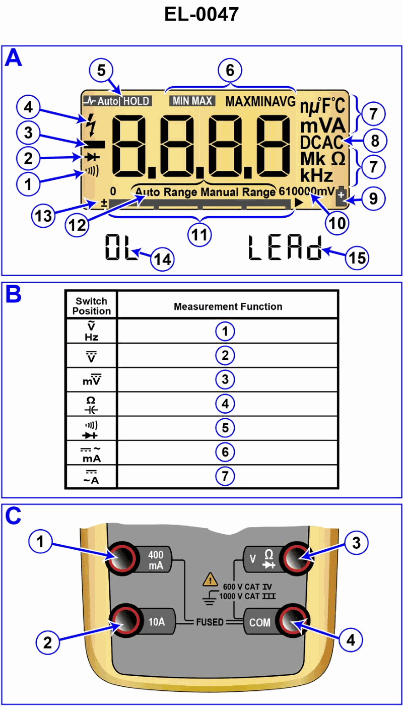 As shown in figure "A" of the illustrated digital multimeter screen, what would be the significance of the symbol indicated by "2" being illuminated? Illustration EL-0047