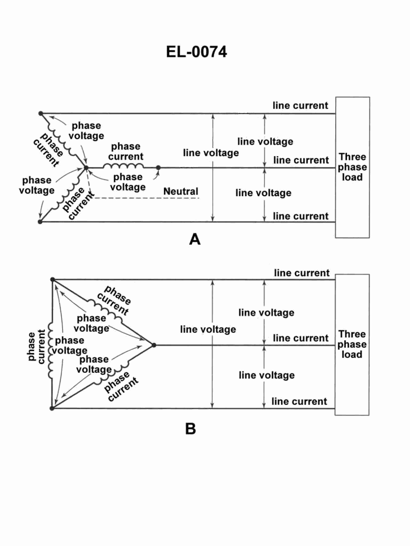 As shown in figure "A" of the illustrated three phase alternator showing the stator winding connections, what can be said about the output line current? See illustration EL-0074.