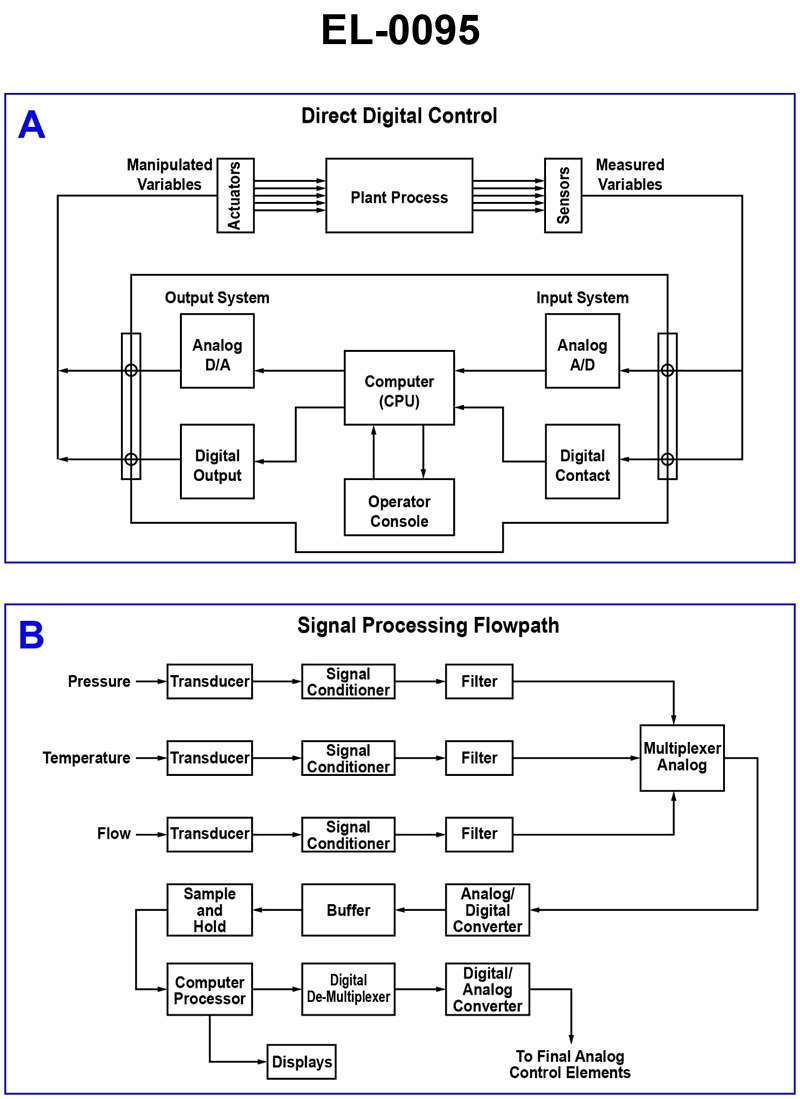 As shown in figure "B" of the illustrated block diagram of the signal processing flow path, the block "TRANSDUCER" represents a sensing and transmitting device designed to sense and measure a physical parameter and convert it into a proportional force or signal of what type? Illustration EL-0095