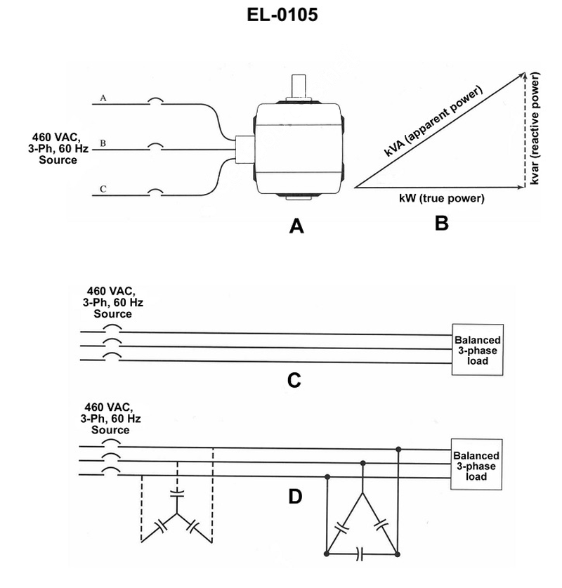 As shown in figure "B" of the illustration, for the illustrated AC electrical system power triangle, which value represents the power factor for the system? See illustration EL-0105.