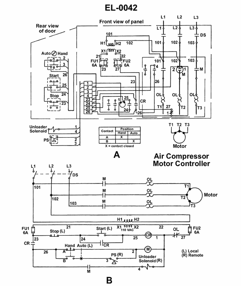 As shown in figures "A" and "B" of the illustration, what action is required to restart the compressor if the compressor drive motor trips out on overload? See illustration EL-0042. See illustration EL-0043.