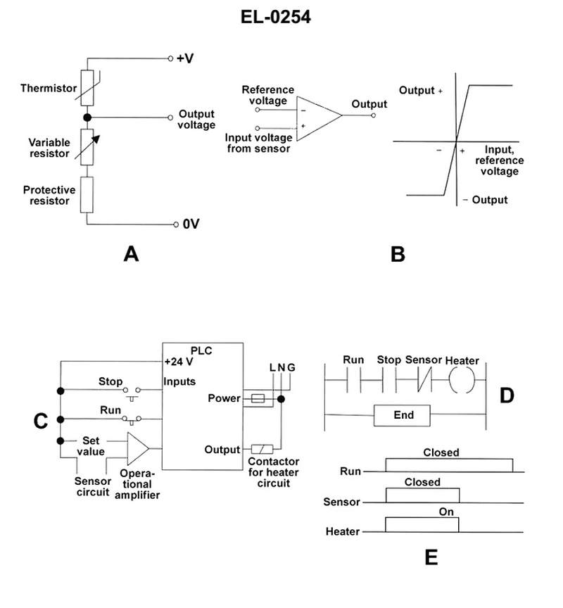 As shown in figures "A", "B", "C", "D" and "E" of the illustration pertaining to various diagrams specific to a PLC controlled temperature control system using a thermistor and operational amplifier, which statement is true? See illustration EL-0254.