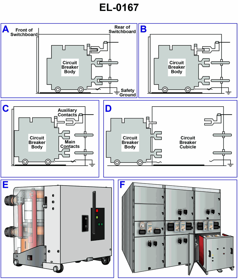 As shown in figures "E" and "F" of the pictured high voltage rack mounted circuit breaker, which figure represents the circuit breaker position when in the open or tripped position? Illustration EL-0167