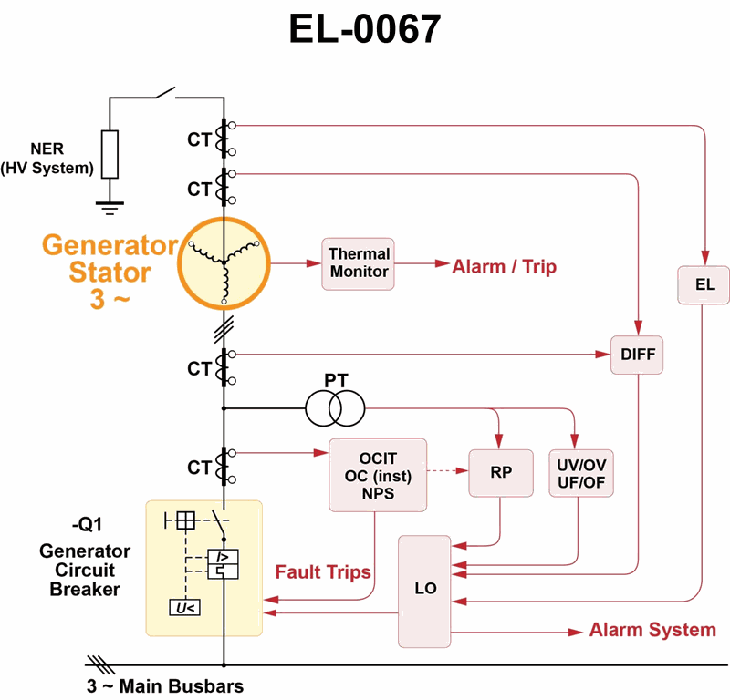 As shown in the alternator protection scheme diagram, what device provides the input to the overcurrent inverse time relay "OCIT", the overcurrent instantaneous trip "OC (inst.)", and the negative phase sequence relay "NPS"? Illustration EL-0067