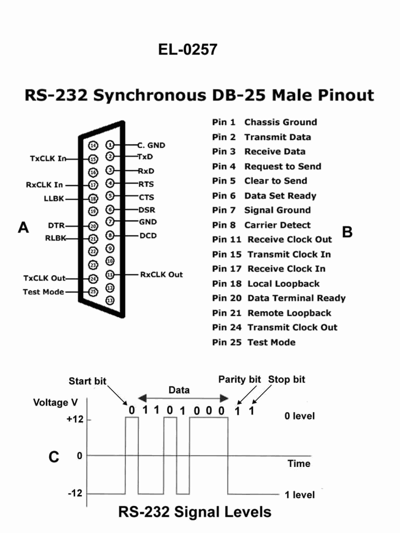 As shown in the figures "A" and "B" of the illustrated RS-232 Synchronous Serial DB-25 connector, what pin is used as the output data pin during serial communications? See illustration EL-0257.