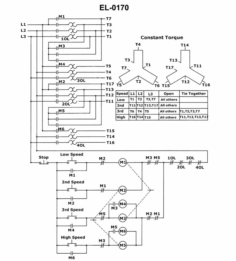 • On the ladder diagram, follow the path from the control power line, through the STOP and speed selector pushbuttons, to coil M1. Which contact symbols (labeled with other “M” designations) must be closed for M1 to energize?