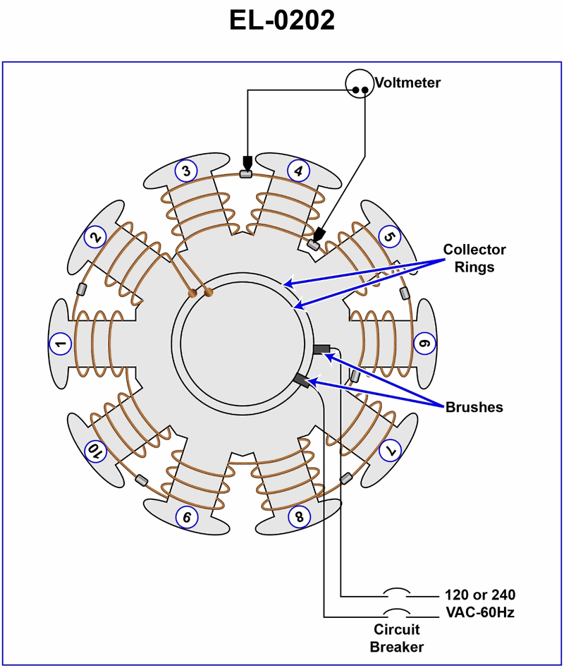 As shown in the illustrated diagnostic setup for locating a shorted field coil of a ten-pole salient pole alternator, if 240 VAC/60 Hz is applied across the brushes, what would be the voltage drop across field coil No.4 if that field coil had shorted turns and the other field coils were free of shorts? Illustration EL-0202