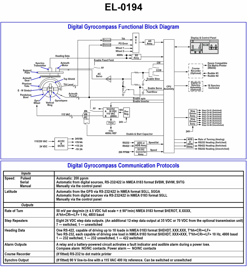 As shown in the illustrated digital gyrocompass functional block diagram and the associated communication protocols table, what would the rate of turn signal voltage be if the rate of turn is 30 degrees per minute to port? Assume that the rate of turn to port signal voltage is negative in polarity and that the rate of turn to starboard signal voltage is positive in polarity. Illustration EL-0194