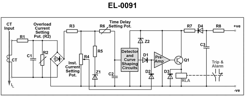 As shown in the illustrated electronic overload relay circuit, what is the functional purpose of potentiometer "R2"? Illustration EL-0091