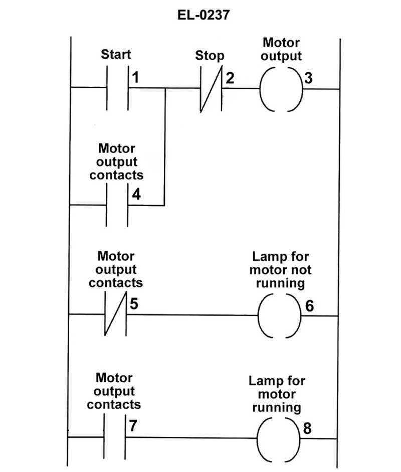 As shown in the illustrated ladder diagram for a programmable logic controller used to control a motor, what statement is true? See illustration EL-0237.