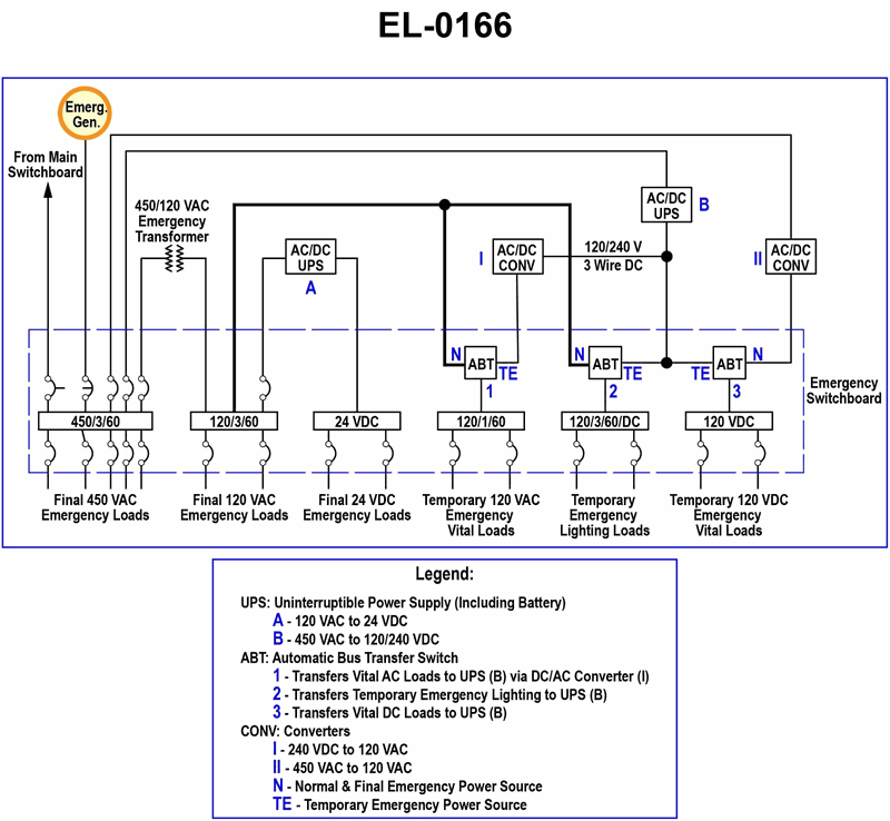 As shown in the illustrated one-line diagram of a two-tiered emergency power system for a passenger ship, what statement is true? Illustration EL-0166