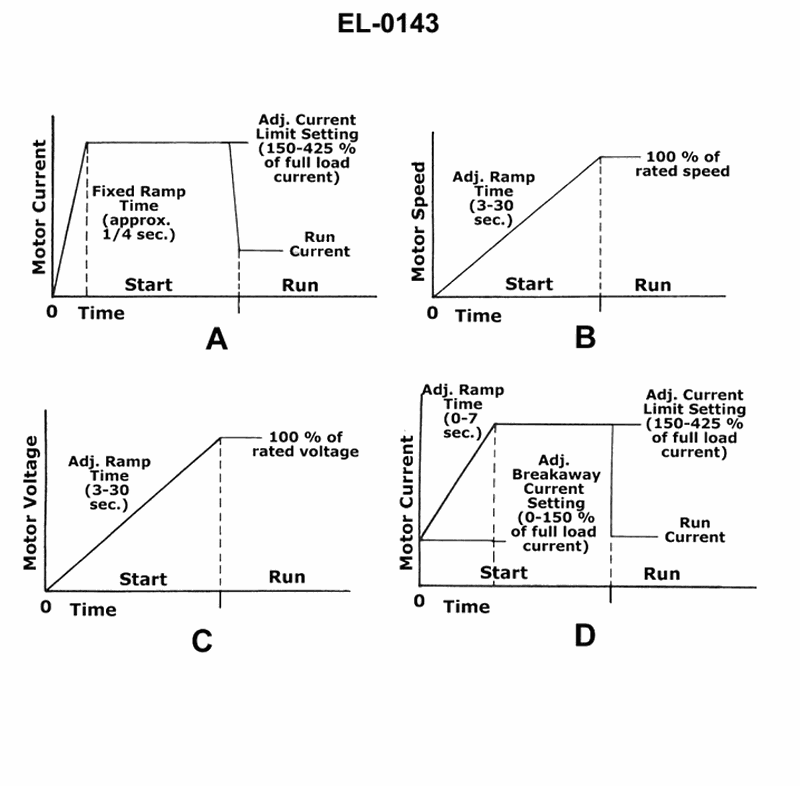 As shown in the illustrated solid-state stepless acceleration starting method graphs, which figure graphs a starting method that would require a tachometer input? See illustration EL-0143.