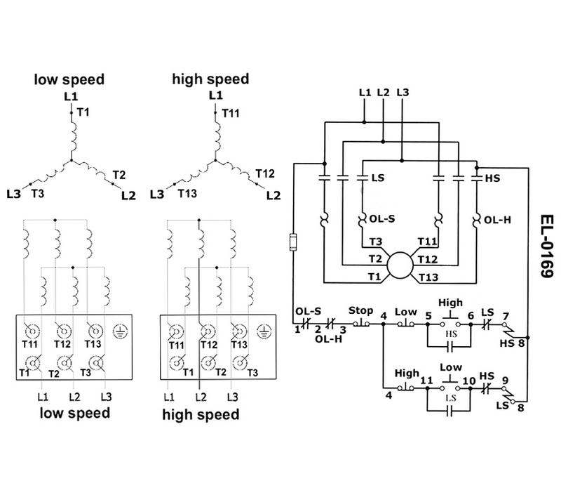 Each of the low speed and high speed windings are protected by its own separately sized overload heaters and the each of the overload relay contacts are common to both the high and low speed contactor coils.