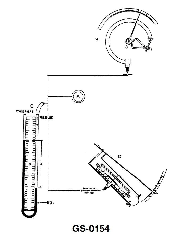 As shown in the illustration, the gage labeled "C" contains mercury and both devices "B" and "D" indicate 'zero' units when exposed to atmospheric pressure. If the pressure indicated on "A" is 16.2 psia, the corresponding readings of the gages "B", and "D", and the height "H" for device "C" should be __________. See illustration GS-0154.