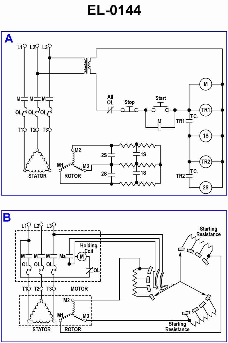 As shown in the illustration, what type of motor is controlled as depicted in both figure "A" and in figure "B"? Illustration EL-0144