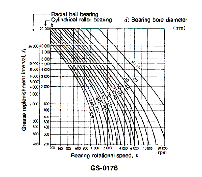 As shown in the illustration, what would be the recommended grease replenishment interval for a 5 1/2 inch radial ball bearing operating under normal load at approximately 1000 rpm? See illustration GS-0176.