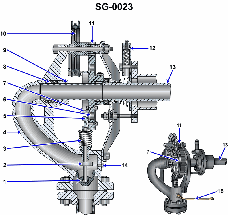 As shown on the illustrated soot blower diagram, what item is responsible for opening and closing the steam admission poppet valve at the appropriate times during element rotation? Illustration SG-0023