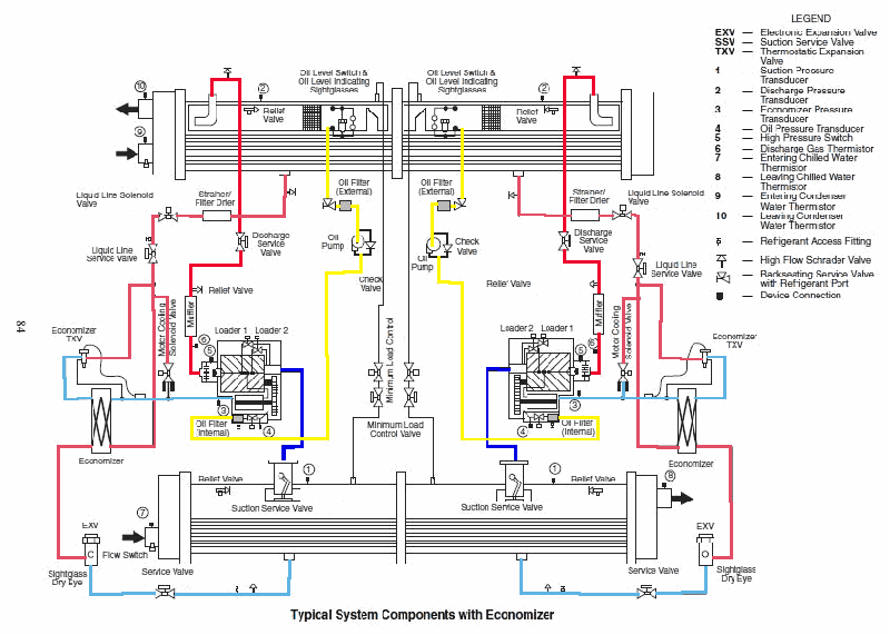 As shown the illustrated water-cooled rotary chiller refrigerant flow and lubricating oil circuits, which of the listed thermistors is used as a sensor for the electronic control circuit for the electronic expansion valve? See illustration GS-RA-29.