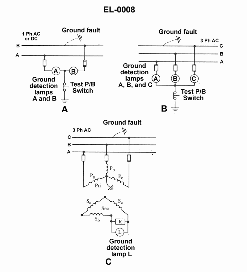 Assume that the circuit shown in figure "A" of the illustration represents a two-wire single phase AC ground detecting system. If a ground occurs on line "B" as illustrated, which of the lamps will burn the brightest, before the test pushbutton switch is depressed? See illustration EL-0008.