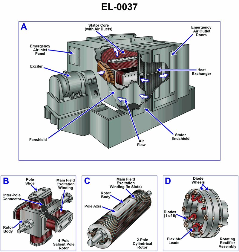 Assuming the alternator shown in figure "A" of the illustration is equipped with a diode plate as configured in figure "D", what is the purpose of the diode plate? Illustration EL-0037