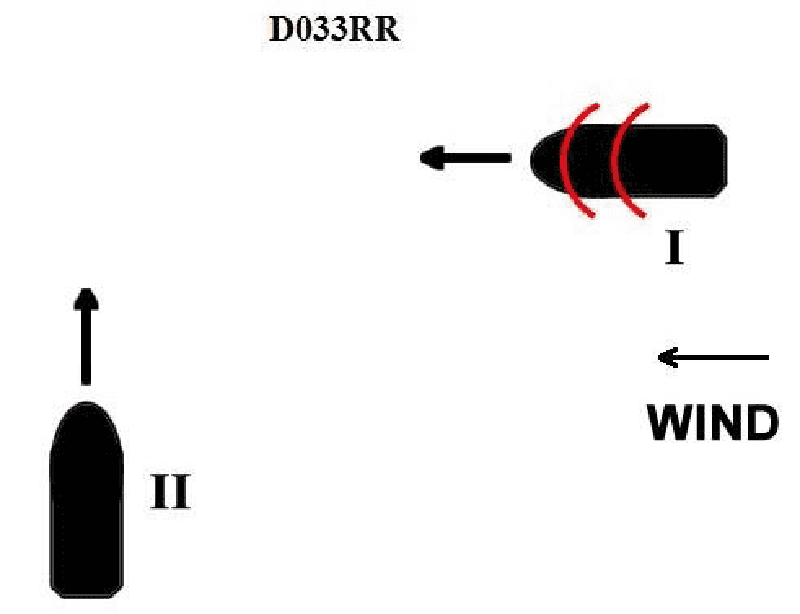 BOTH INTERNATIONAL & INLAND Vessels I and II are underway as shown in illustration D033RR below. Vessel I is a sailing vessel with the wind dead aft. Vessel II is a power-driven vessel trawling. Which statement is TRUE?