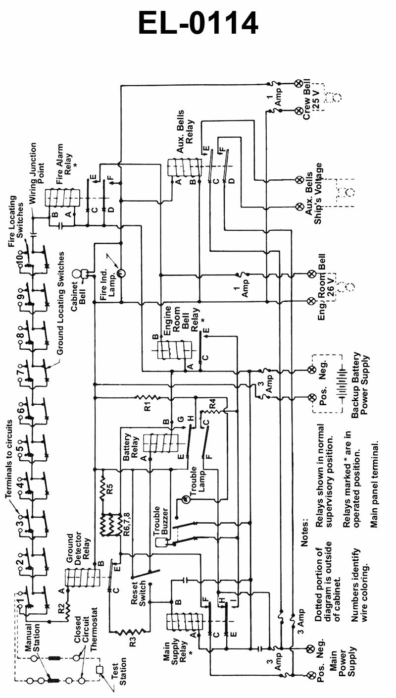 Concerning the illustrated fire detection and alarm system, when the system is operating normally and under supervision, what is the status of the ground detector and the fire alarm relays? Illustration EL-0114