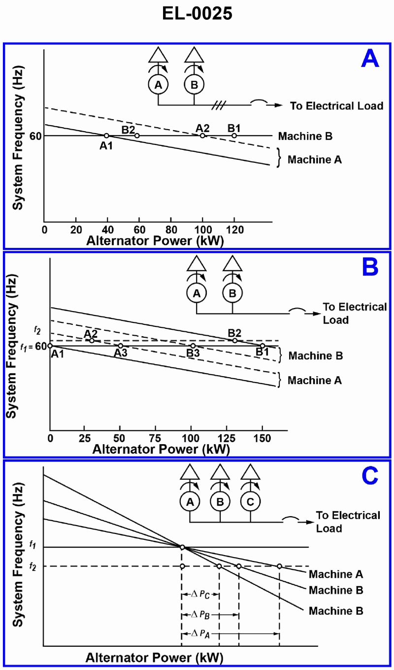 Figure "A" of the illustration represents a constant frequency system. At load condition "1" machine A has a 40 kW load and machine B has a 120 kW load as shown. If load is to be transferred manually to achieve load condition "2" with machine A having a load of 100 kW and machine B having a load of 60 kW, how is this accomplished? See illustration EL-0025.