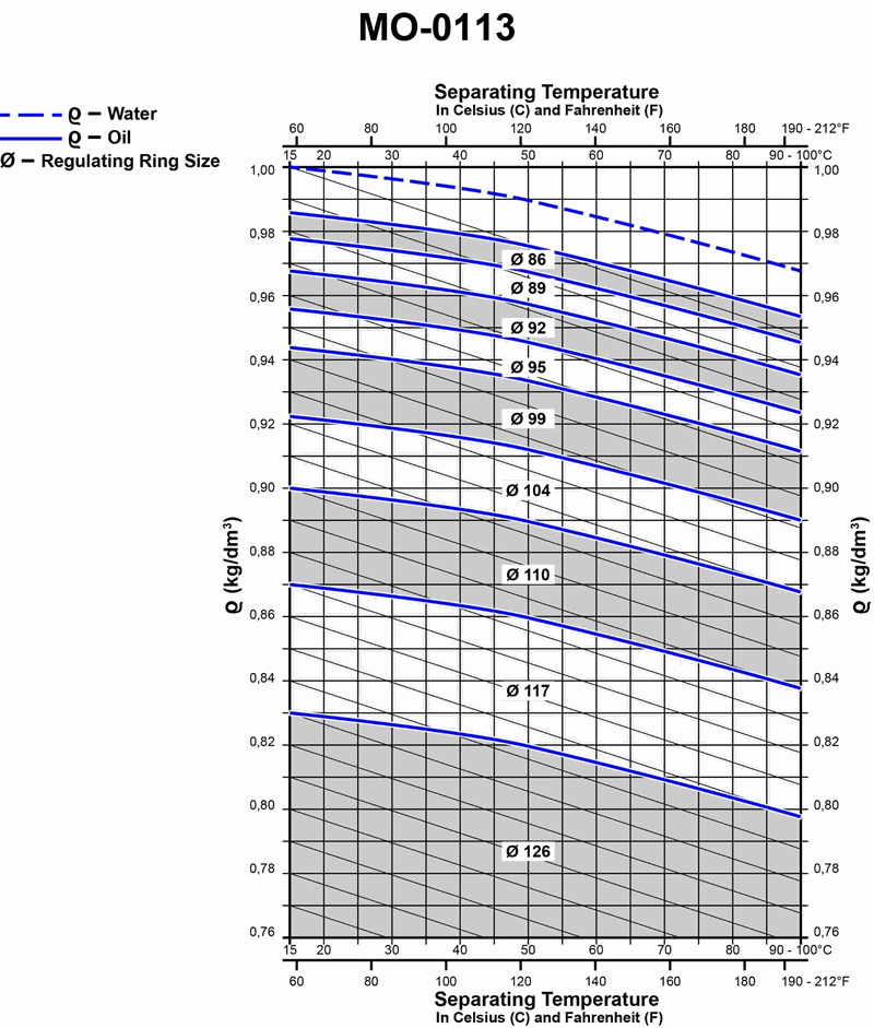 From the graph shown in the illustration, if the separating temperature required is to be 167°F, and the specific gravity of the oil is 0.98 kg/dm3 at 59°F, what size regulating ring is required? Illustration MO-0113