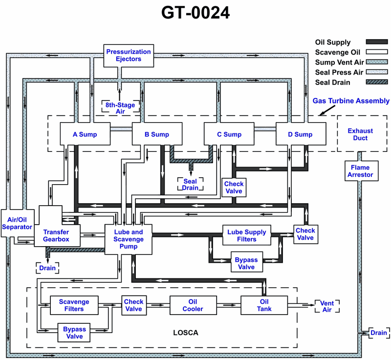 How many lube oil sumps are installed on the marine gas turbine engine shown in the illustration? Illustration GT-0024