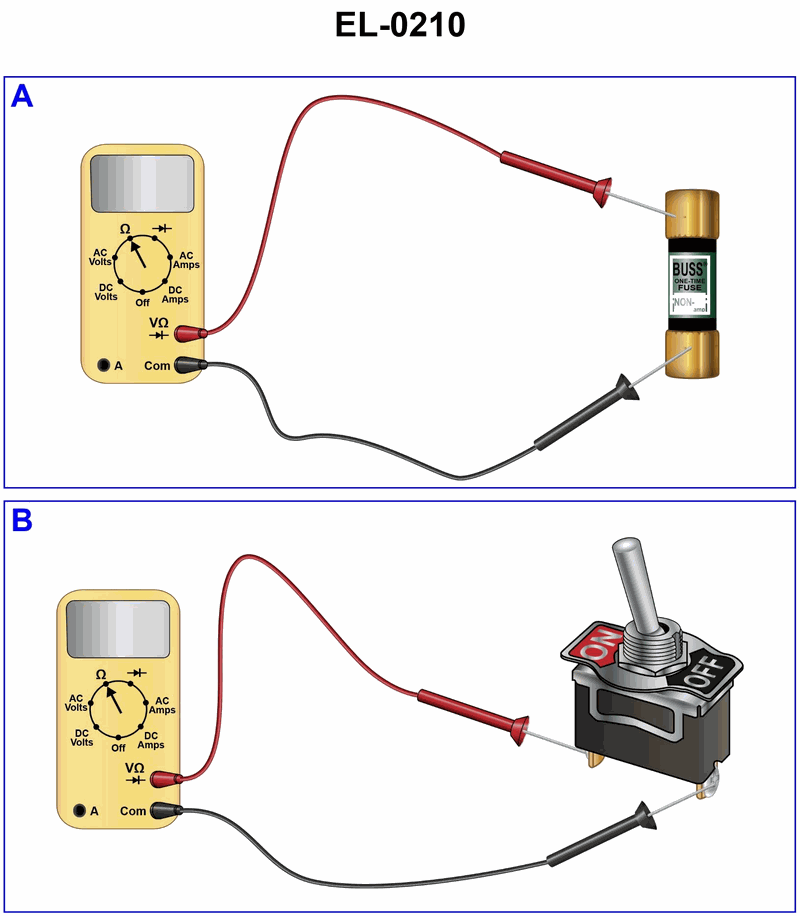 If a digital multimeter is set up as shown in figure "A" of the illustration, what would be displayed on the screen if the fuse being tested is not blown and has proper continuity? See illustration EL-0210.