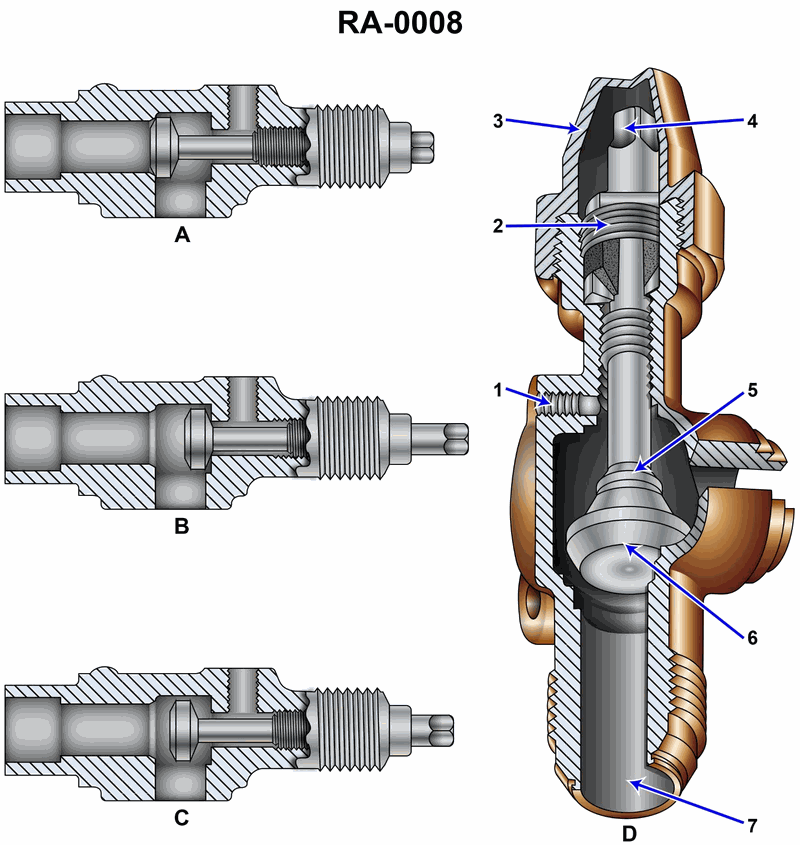 If a refrigeration unit is fitted with suction and discharge services valves constructed similarly to the valve labeled "D" in the illustration, what statement is true concerning the valve status when servicing is complete and the gauge manifold set is removed, with the unit in normal operation, assuming that no permanently installed gauges or pressure switches are connected to the service port "1". See illustration GS-RA-08.