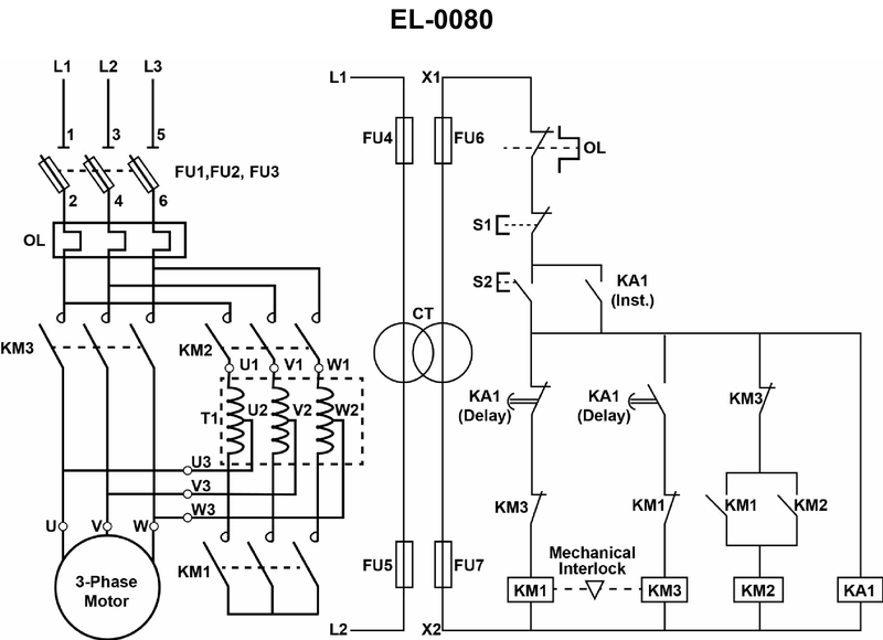 • Look at the left side of the diagram and, with only KM2 closed, identify which transformer terminals (U1/U2, V1/V2, W1/W2) are actually feeding the motor terminals U, V, W