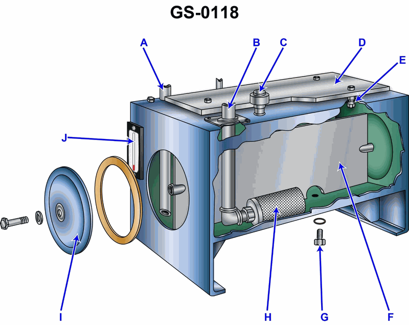 • Tank top fittings (A, B, C, D) – compare which ones connect to internal piping and which simply open into the tank (vent/filler vs. return line).