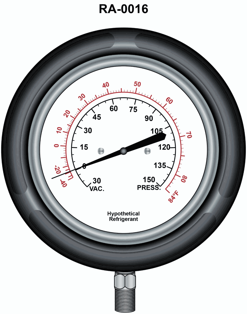 In addition to the indicated gauge pressure, what other information is presented on the compound gauge for the hypothetical refrigerant illustrated? Illustration GS-RA-16