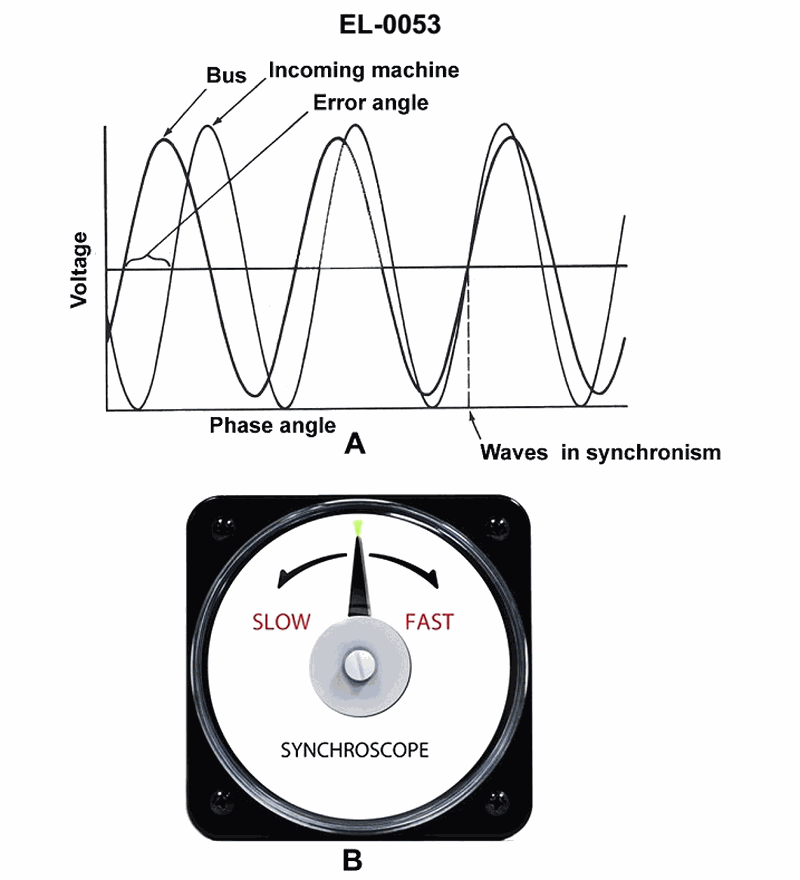 In considering the waveforms as shown in figure "A" of the illustration, what would be the position of the synchroscope pointer as shown in figure "B" of the illustration at the instant the waves are in synchronism? See illustration EL-0053.