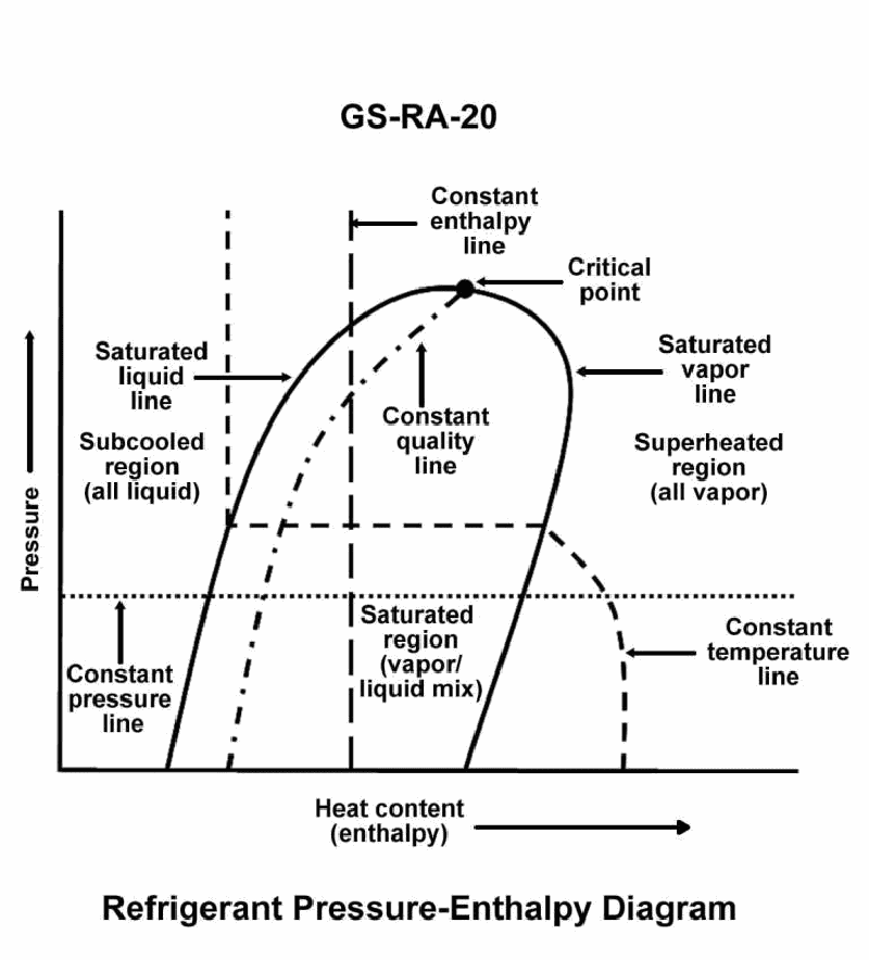 In consulting the refrigerant pressure-enthalpy diagram shown in the illustration, what statement is true concerning the pressure/temperature relationship? See illustration GS-RA-20.