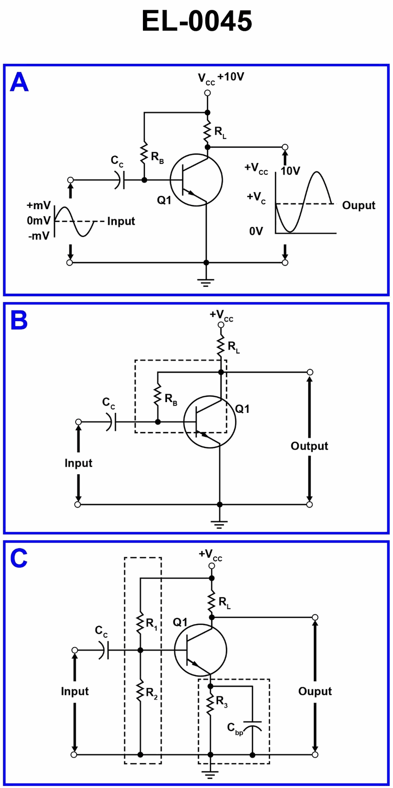 In figure "A" of the illustrated circuit, the amplifier is connected in what basic configuration? Illustration EL-0045