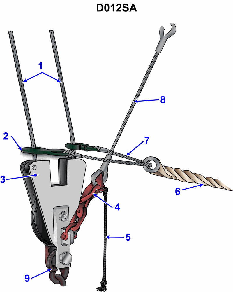 β’ Verify that line 5 operates the red lever mechanism (4) and not any of the wire ropes labeled 1, 7, or 8.