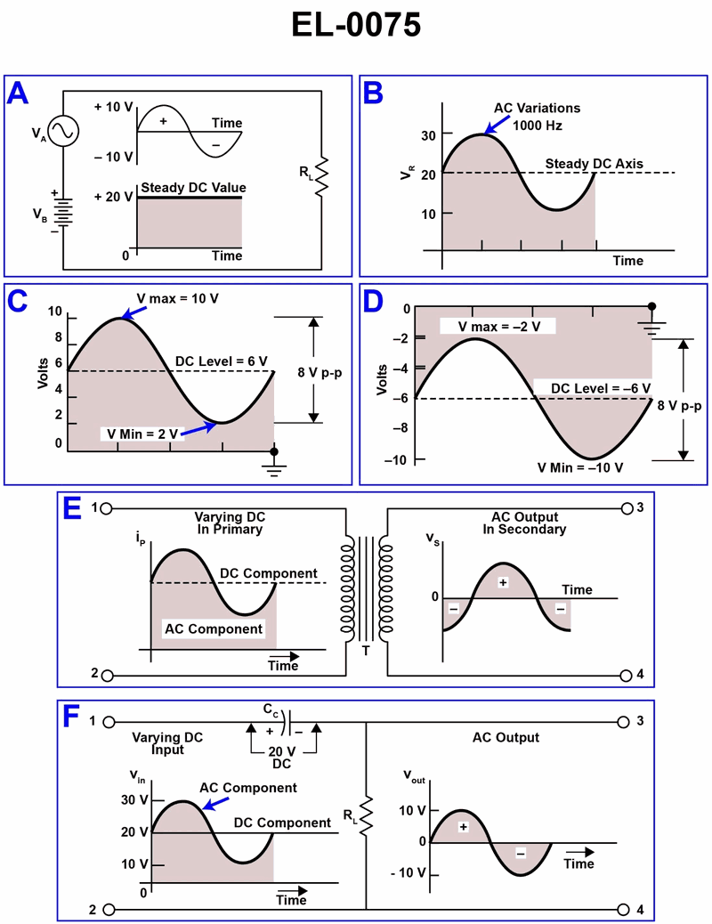 In referring to figure "E" of the illustration, what statement is true concerning the functional purpose of the coupling transformer? Illustration EL-0075