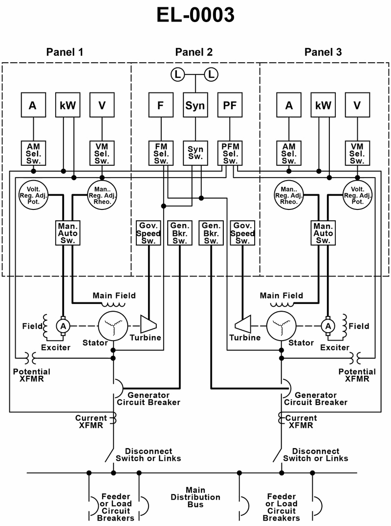 In the diagram of the switchboard shown in the illustration, if one of the turbines should fail due to a throttle trip, what will happen? Illustration EL-0003