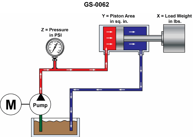 In the illustrated system, what pressure will be indicated on the gage if the load (x) is 9984 lbs (4532.7 kg) and the piston area is 12 sq. in (77.4 sq. cm)? See illustration GS-0062.