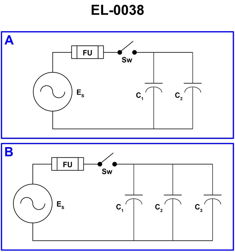In the schematic of the electrical circuit shown in figure "A" of the illustration, assuming that C1 and C2 are equal in capacitance, what is the value of the total capacitance, when compared to the value of equal individual capacitors? Illustration EL-0038