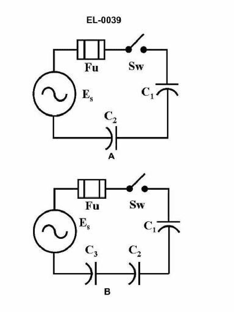 In the schematic of the electrical circuit shown in figure "A" of the illustration, what is the value of the total capacitance, when compared to the value of equal individual capacitors? Illustration EL-0039