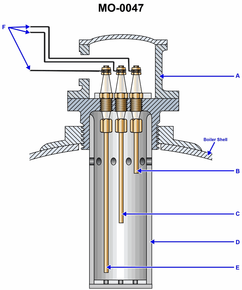 In the water level electrode assembly, shown in the illustration, the feed pump should restart when the level of the water reaches the position indicated by arrow '____'. Illustration MO-0047