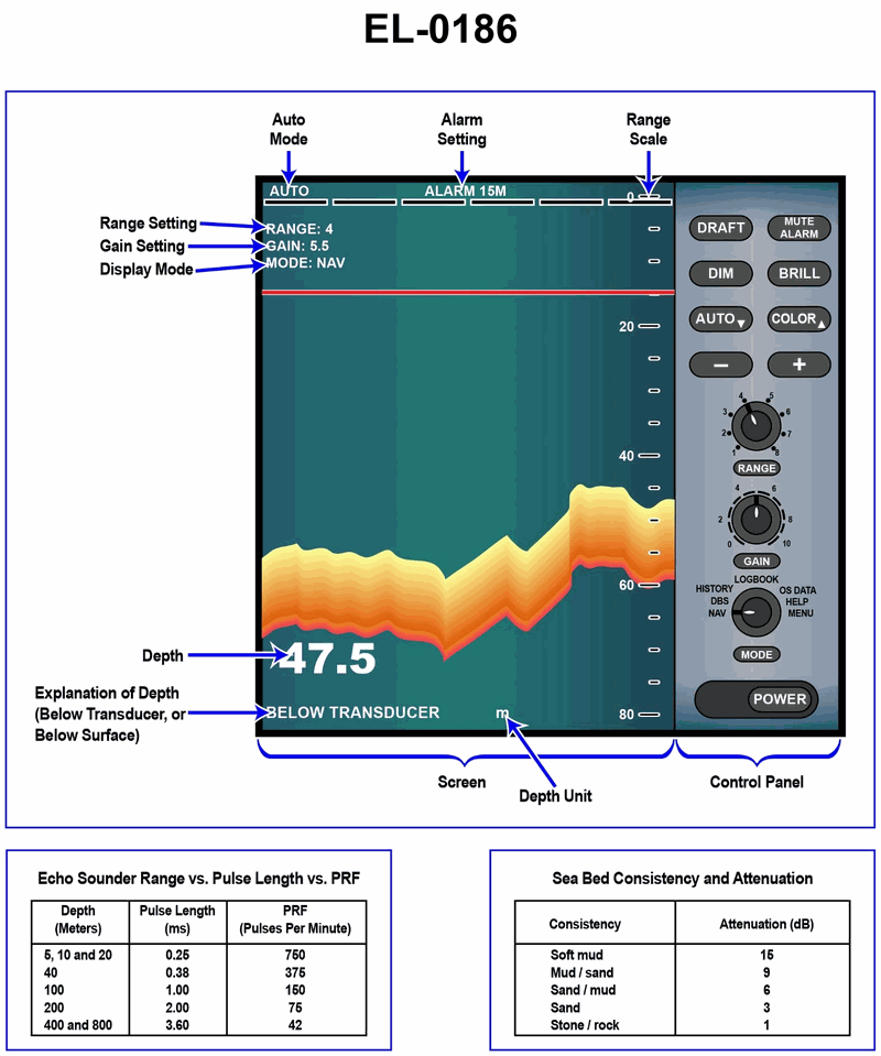 In viewing the liquid crystal display for the illustrated depth sounder data display unit, what should be done if the graphic display of the ocean bottom is no longer visible on the screen? Illustration EL-0186