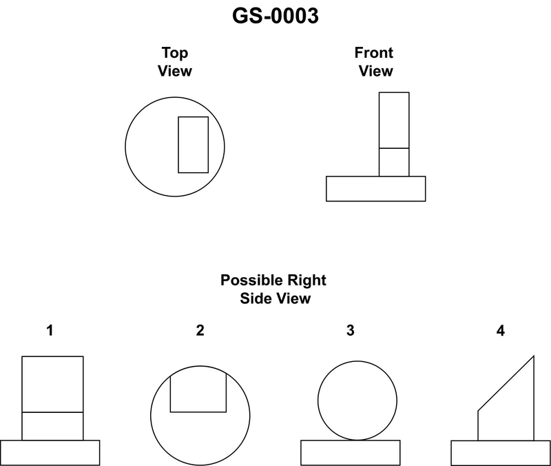 Of the views labeled "1", "2", "3", and "4", select the one that correctly represents the right side view of the unnumbered object in the illustration. Illustration GS-0003