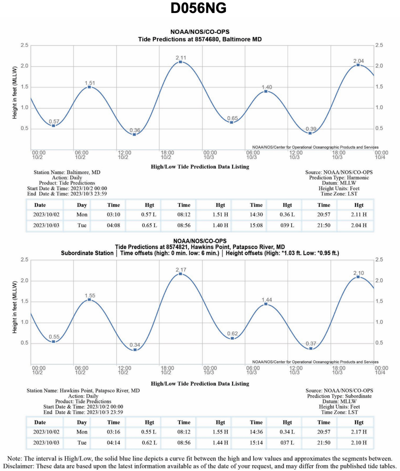 On 2 October 2023, you will be docking at the Dundalk Marine terminals in Baltimore, MD at the first high tide. The berth is located between NOAA reference tidal station #8574680 and subordinate station #8574821. What time (LST) will you be docking? See illustration D056NG.